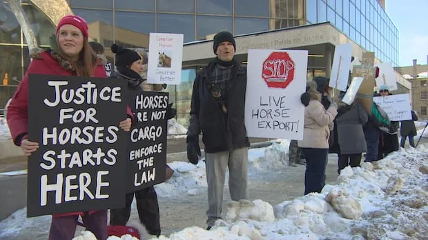 Animal rights supporters protested outside Winnipeg’s law courts during the lunch break. Danae Tonge, organizer of Manitoba Animal Save, calls for a guilty verdict against the exporter and fulfillment of the federal government’s 2021 pledge to halt live horse exports for slaughter. “We want some justice for those horses that suffer, and all the horses that are flown out of Winnipeg, out of Calgary and out of Edmonton airports,” she said.