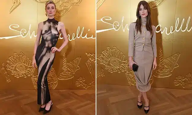 Elizabeth Debicki captivated attendees at the Schiaparelli: Fashion Becomes Art exhibition gala dinner in London’s South Kensington on Tuesday evening. The 35-year-old Australian actress posed confidently in a striking naked torso illusion dress featuring a high neckline, sleeveless design, and figure-hugging bodice with a bold print.