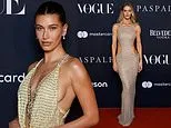 Hailey Bieber, 29, leads arrivals in a striking butter-yellow Versace gown from the spring/summer 2006 collection. The floor-length dress features a deep plunging neckline reaching the waist, a jewel-encrusted central panel, and intricate crystal beading, rhinestones, and sequins. An embellished mesh bodice pairs with a silk skirt boasting a thigh-high split trimmed in tulle. She pairs the look with delicate diamond drop earrings, a sleek brunette up-do, bronze eyeshadow, and glossy lips.