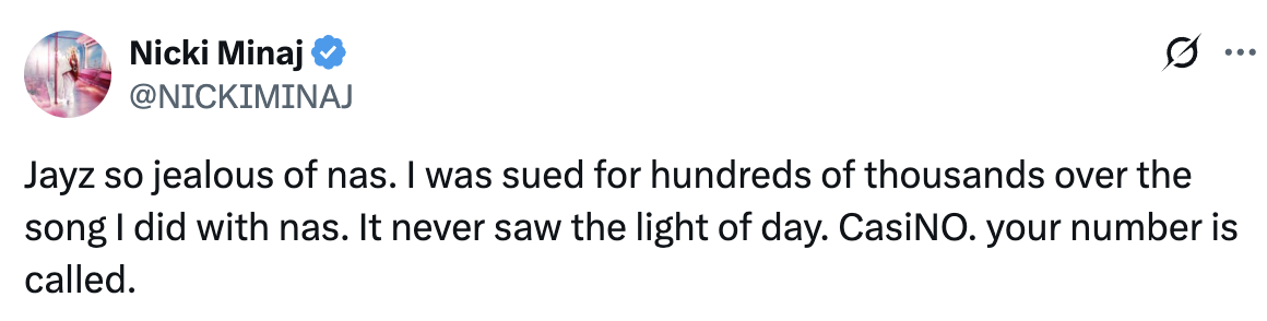 Minaj additionally claimed Jay-Z had points with one other collaboration, this time with Nas, which she mentioned led to a pricey authorized battle.