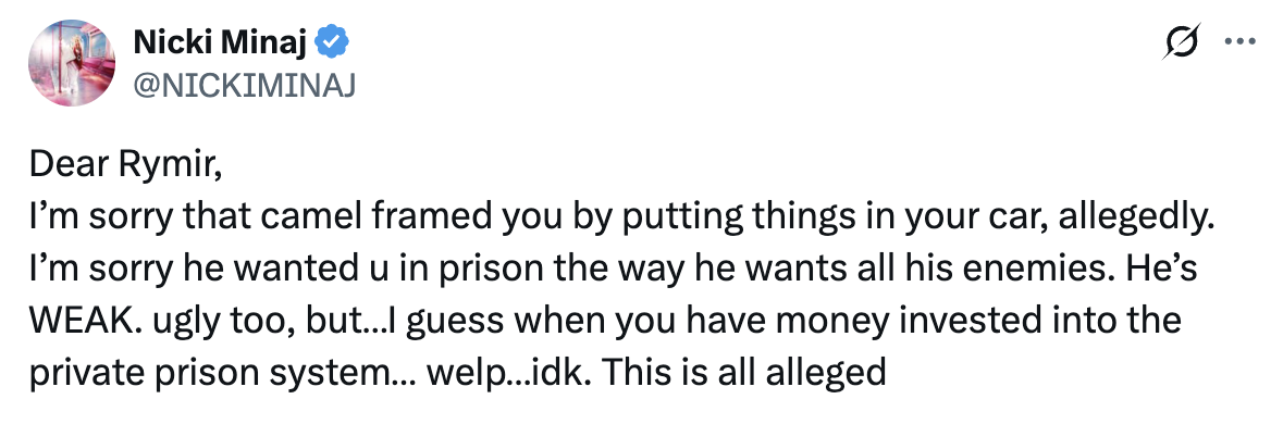“Pricey Rymir, I’m sorry that camel framed you by placing issues in your automobile, allegedly. I’m sorry he needed u in jail the best way he needs all his enemies,” she wrote. “He’s WEAK. ugly too, however…I suppose when you might have cash invested into the personal jail system… welp…idk. That is all alleged.”