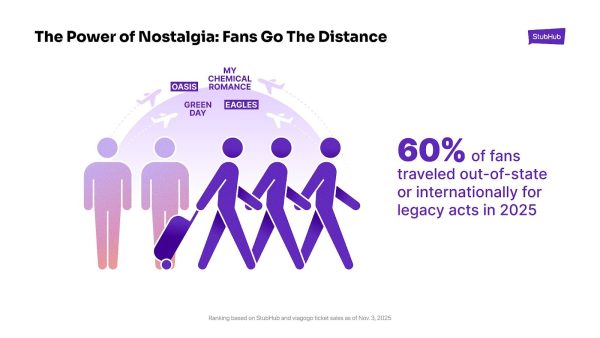 StubHub additionally highlighted the rising nostalgia financial system. Legacy artists are inspiring followers to journey, with 60 p.c of ticket patrons crossing state or worldwide strains to revisit the music of their previous.