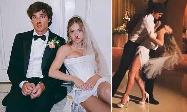 Off-camera glimpses show Sweeney and Elordi, both 28, in wedding attire with blood smeared above their lips. Another image captures their steamy first dance, with Elordi cradling Sweeney’s face amid giggles.